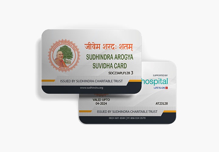 Sudhindra Arogya Suvidha Card for APL families is a health card issued by Sudhindra Charitable Trust in association with KMC Hospital. It has a validity of 1 year and is acceptable at KMC Attavar, Durga Sanjeevani Hospital, Kateel. The cost of the card is ₹. 750/- per card with a member cap of 5 people. Additional members beyond 5 will be charged at ₹. 100/- per head.